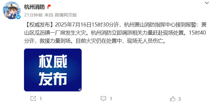 2025年7月16日15时30分许,杭州萧山消防指挥中心接到报警:萧山区瓜沥镇一厂房发生火灾。杭州消防立即调派相关力量赶赴现场处置。15时40分许,救援力量到场。目前火灾仍在处置中,现场无人员伤亡。